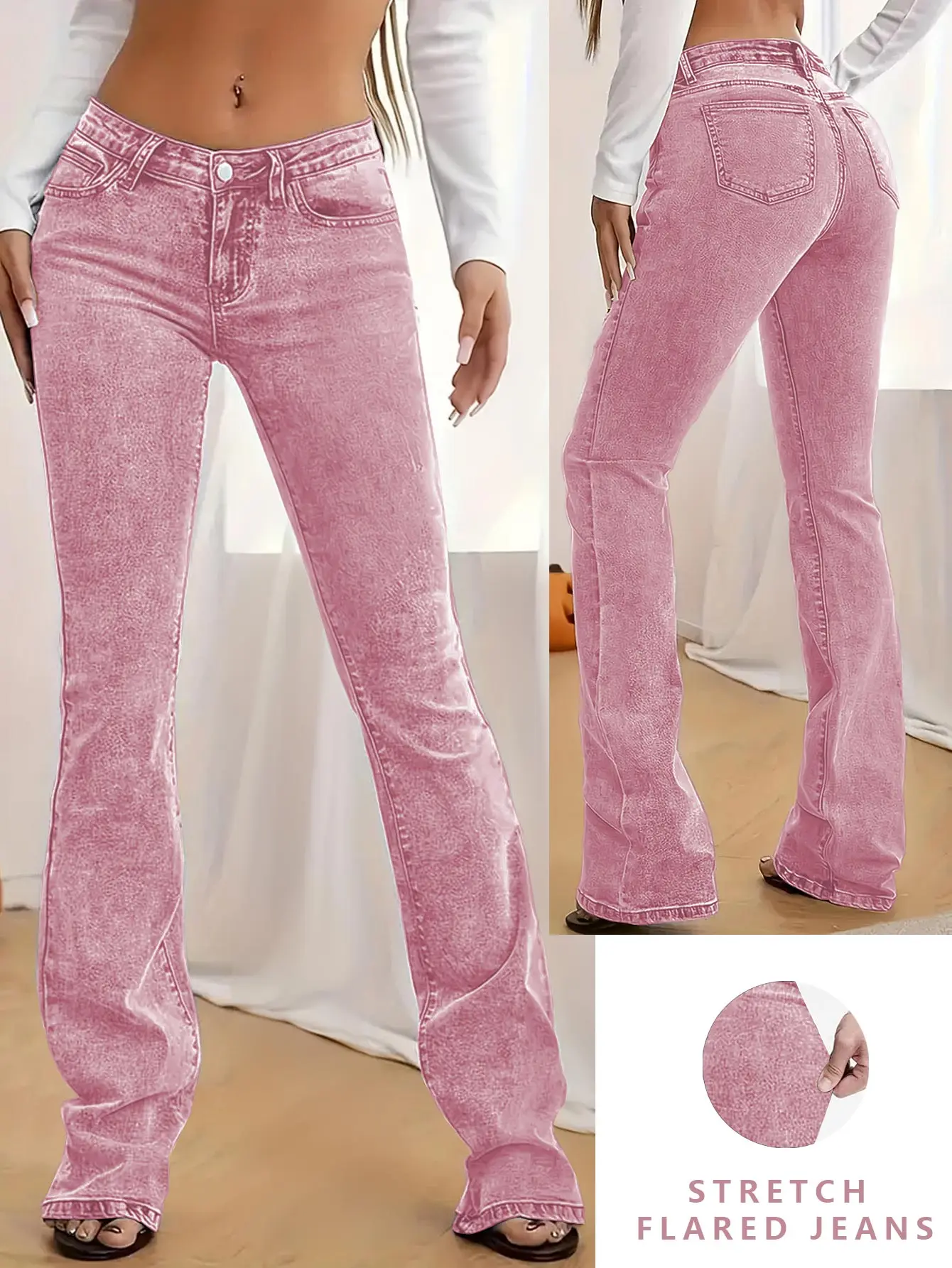 Y2K-Women's stretch jeans pink wash, low waist slim fit fashionable sweet flared jeans, button placket, fashionable sexy jeans.