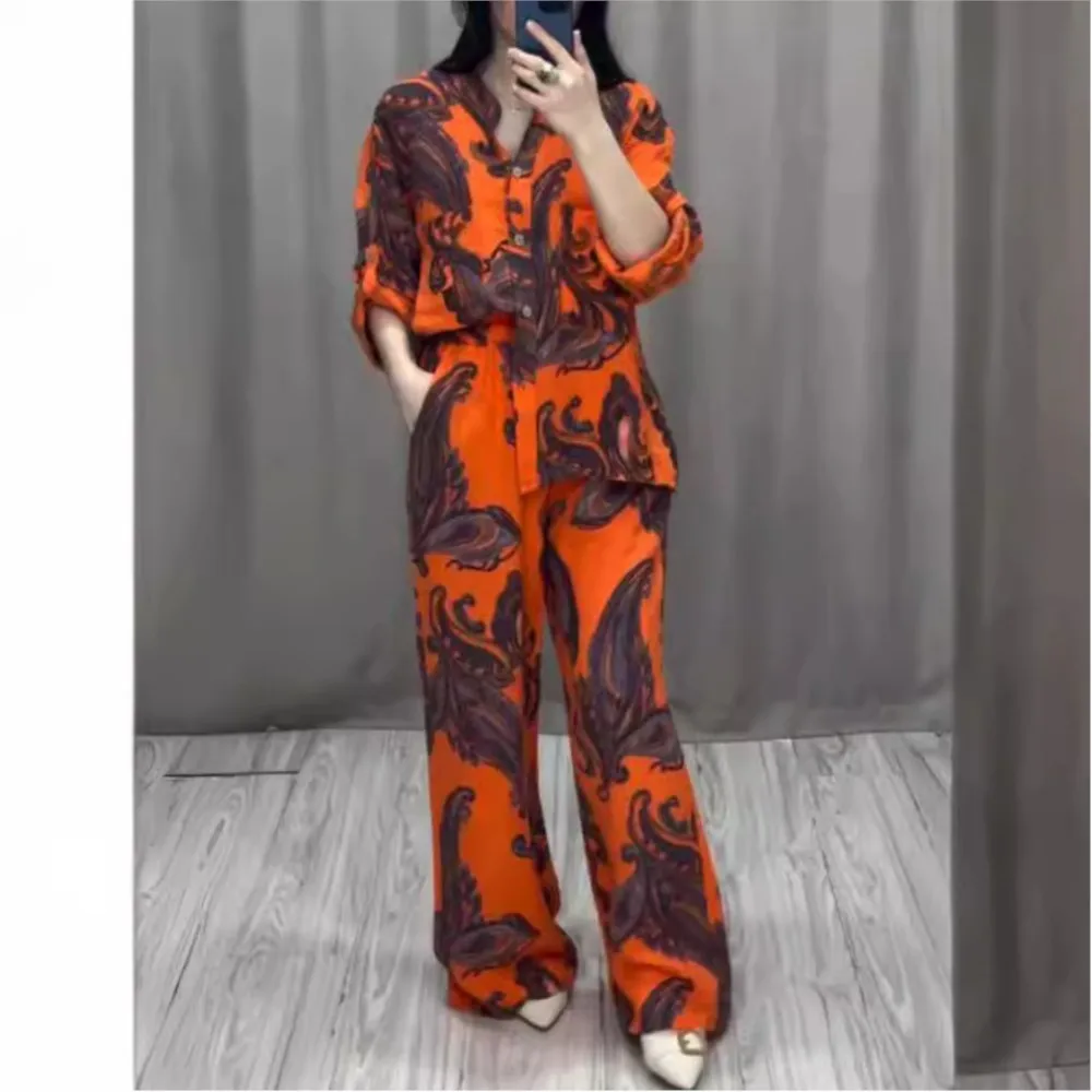 Fashion Sleeved Shirt Women's Suit Spring Autumn New Fashion Printed Pants Pocket Simple Slim Pants Female Office 2 Piece Set