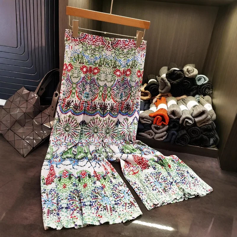 Miyake Pleated Printed Pants 2025 Summer Niche Design Pleated Printed Wide Leg Pants Women Simple Casual Straight Long Women