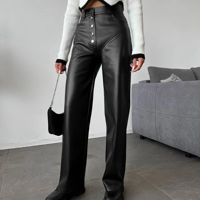 2025 Fall Winter Solid PU Leather Loose Straight Pants Women Fashion Buttons High Waist Casual Trousers Streetwear Bottoms