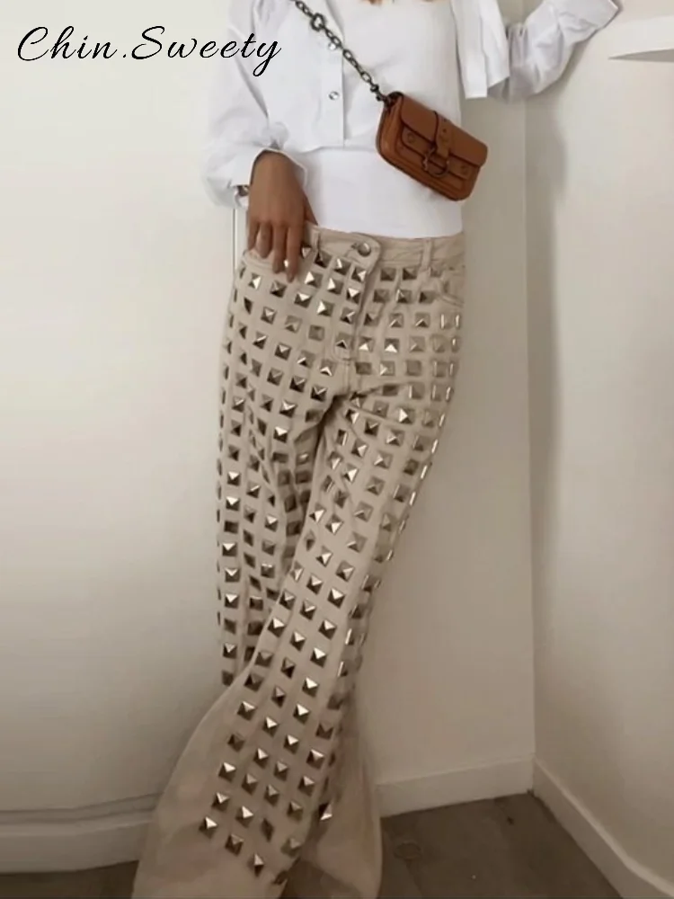 Vintage Rivet Denim Trousers Women Solid Buttons Pockets Slim Straight Wide Leg Pants 2025 Autumn Winter Lady High Street Jeans