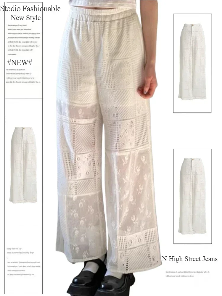 Summer Women's Hollow Lace Layered Straight Leg Wide Leg Pants Korean Fashion Casual Y2K Splicing Retro Women Splicing Pants