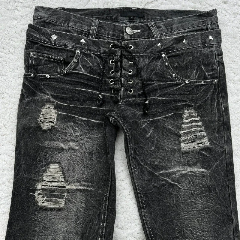 New retro double waisted lace up micro flared women pants streetwear Y2K washed high-quality design sense men and women jeans
