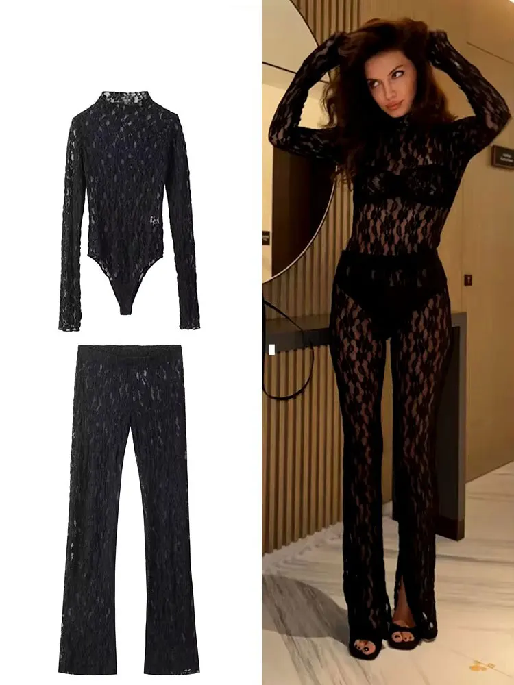HH Womens Lace Pants Sets Slim Jumpsuits Top + High Waist Trousers Sexy Lady Floral Lace Translucent Y2k Bodysuit Suits