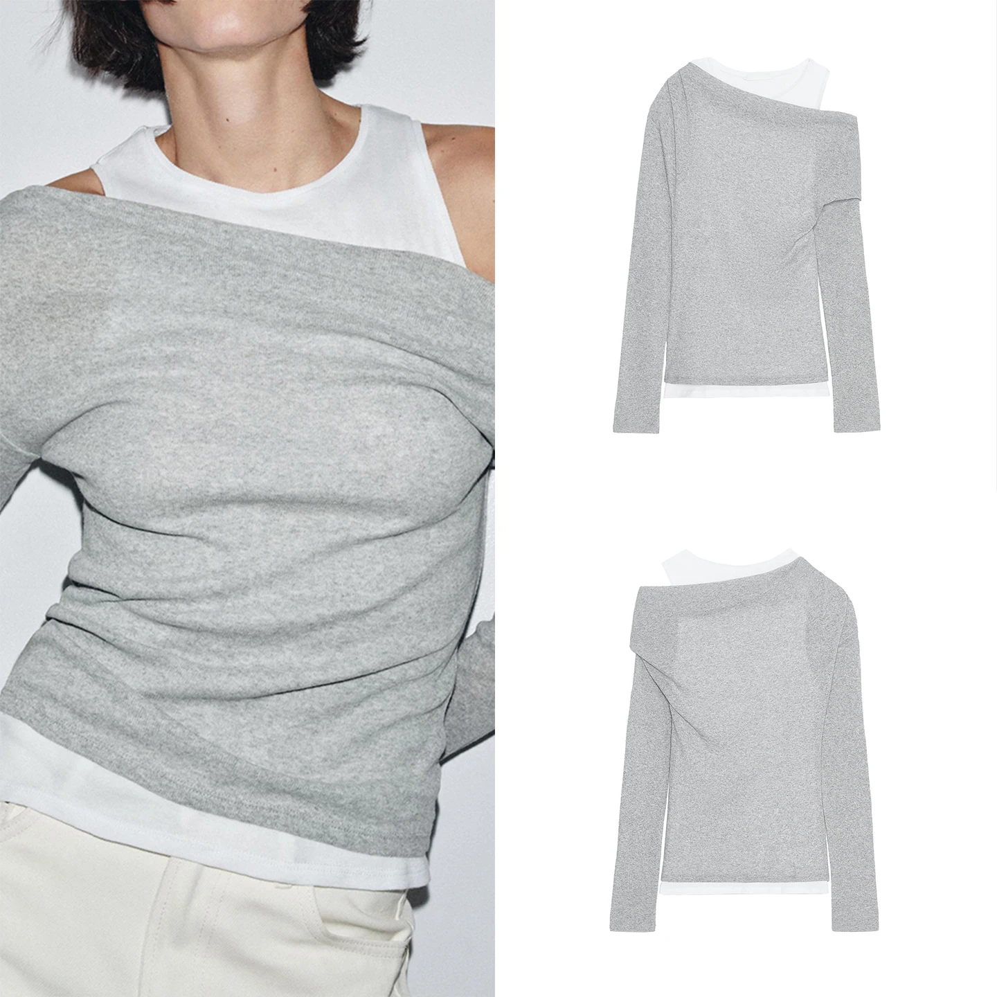 Double Layer Effect Long Sve Asymmetric Women's Sle T-irt Casual Fit round Neline Regular Length Chinese Brand Z