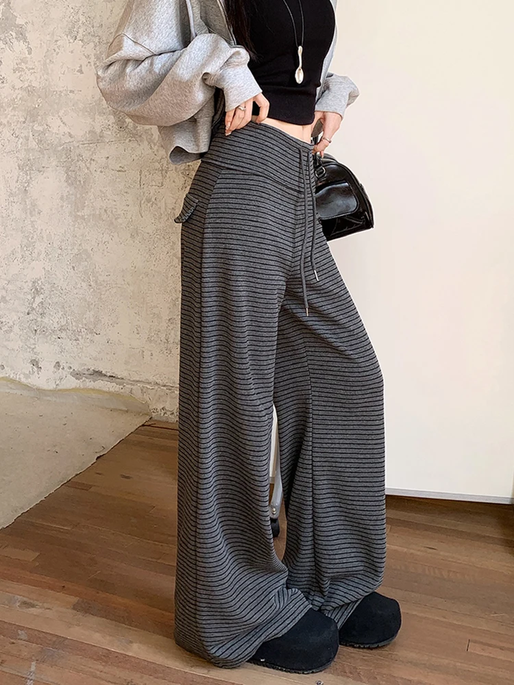 Harajuku Striped Women Pants Fall Winter Loose Casual Streetwear Wide Leg Trouser Female Retro Lace Up Straight High Waist Pants