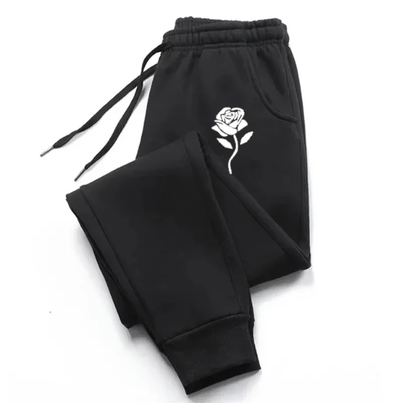 White Rose Printing Women'S Autumn Casual Basic Pants Versatile Pocket Comfortable Drawstring Trousers Trendy Street Comfy Pant