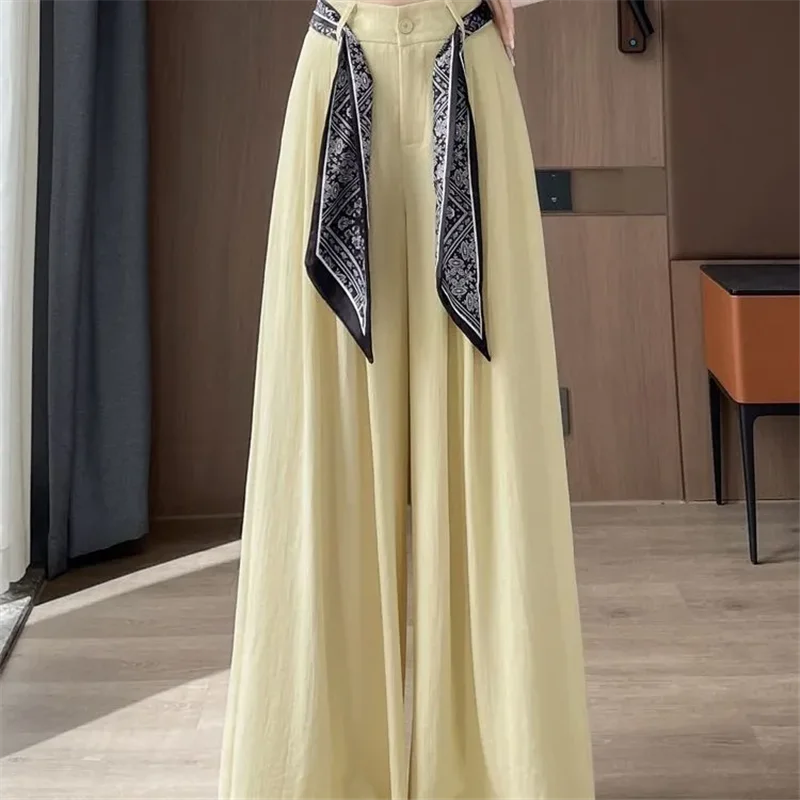 2026 Spring Autumn New Women Pants Fashion Scarf Belt High-Waisted Trousers Female Black White Casual Loose Wide-Leg Pants W1059
