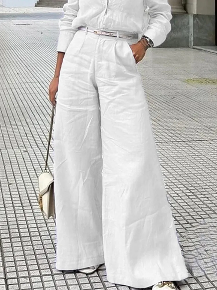 High Waist Solid Color Wide Leg Pants Summer Chic Loose Elegant Metal Flared Pant Office Ladies Straight Holiday Women Trousers
