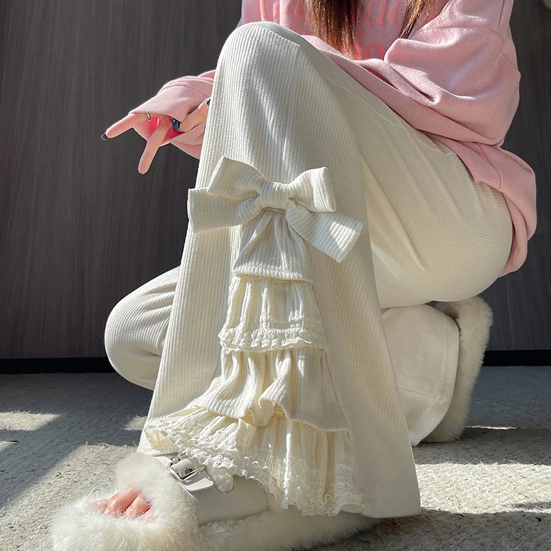 Harajuku Corduroy Flare Pants Women Japanese Cute Bow Lace Patchwork Pants Winter Streetwear Kawaii High Waist Casual Trousers