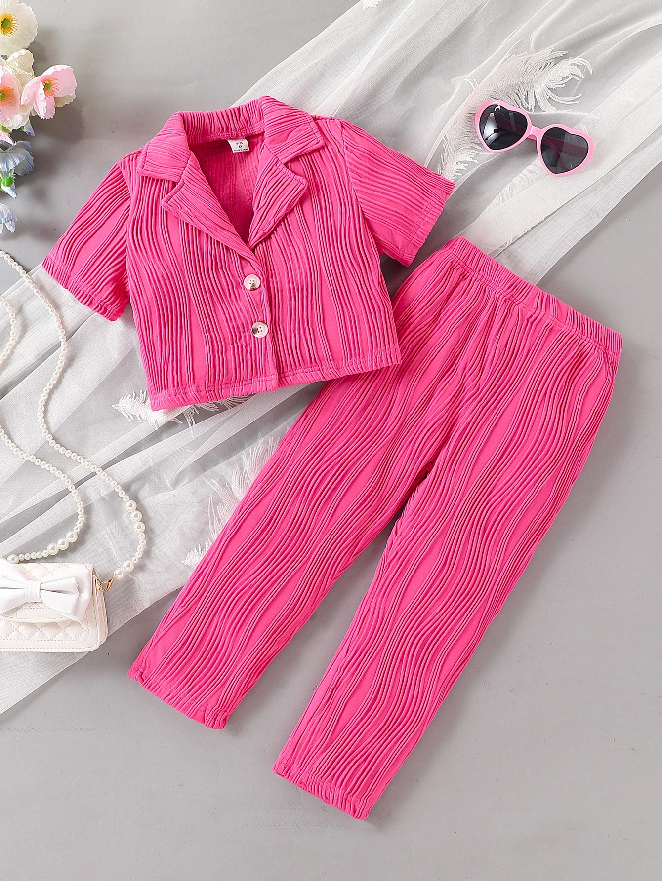 Girls Rose Red Pleated Suit Short-Sleeved V Neck Buttoned Top and Pants Fashion Clothing