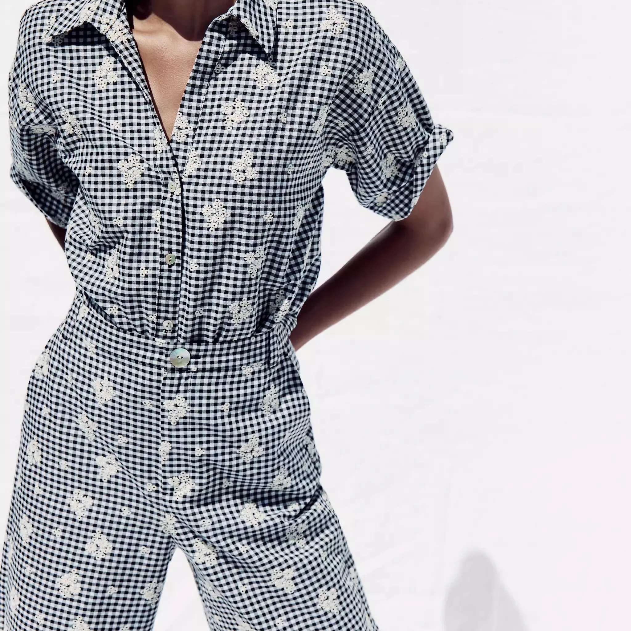 2025 Summer New Women's Embroidered Plaid irt Versatile Wide Leg Pants Commute Sle Regular Fit ort Sve Button up