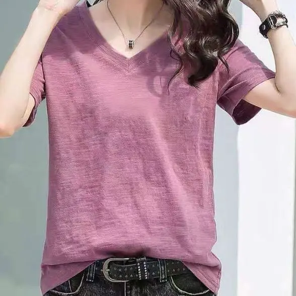 00% Pure Cotton Bamboo Rayon ort Sve Women's T-irt Loose Fit V-ne Top Korean Sle plus Size f Sve irt