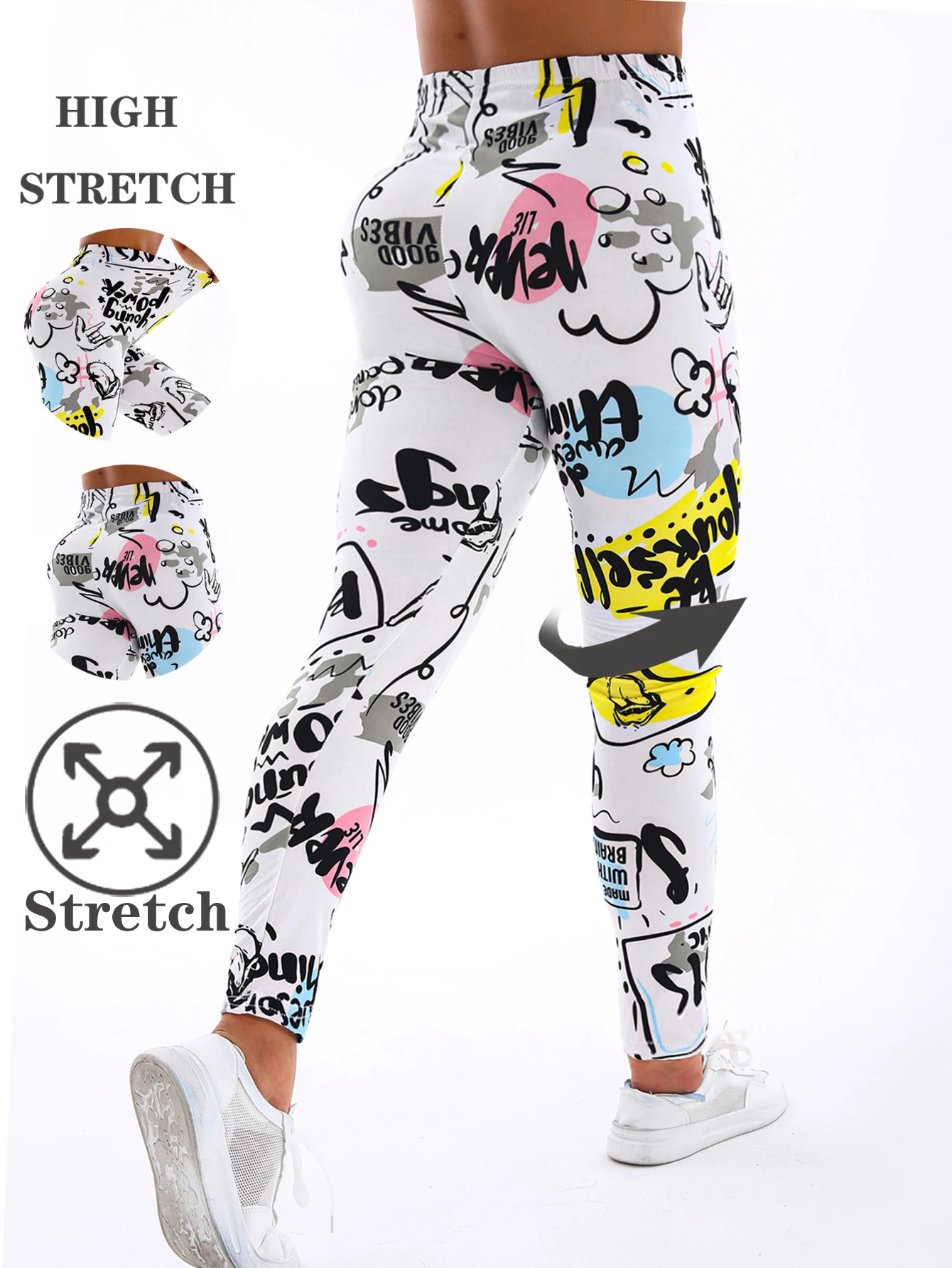 White And Yellow Letter Printed Casual Tight Pants For Women High Elasticity Fitness And Yoga Pants Sexy Nine Point Pencil Pants