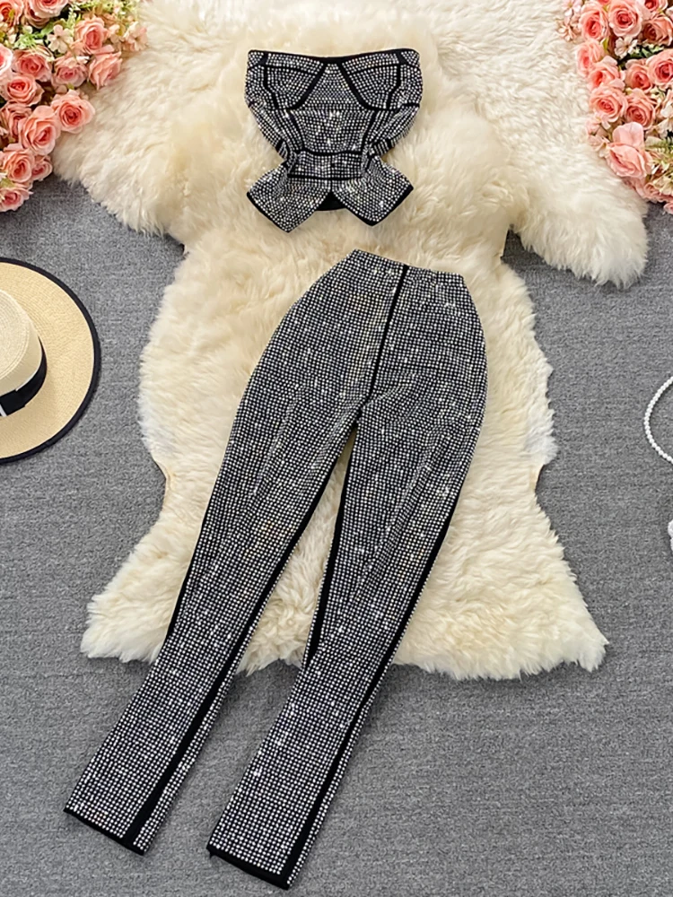 Sexy Women Black/White Diamonds Two Piece Set Party Slash Neck Off Shoulder Camis Tops + High Waist Pants Female Suit Autumn New