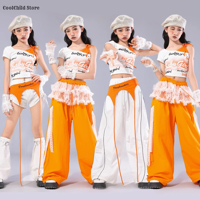 Girls K-pop Off Shoulder Crop Top Lace Cargo Pants Dance Shorts Kids Hip Hop Streetwear Children Jazz Girl Group Clothes Sets