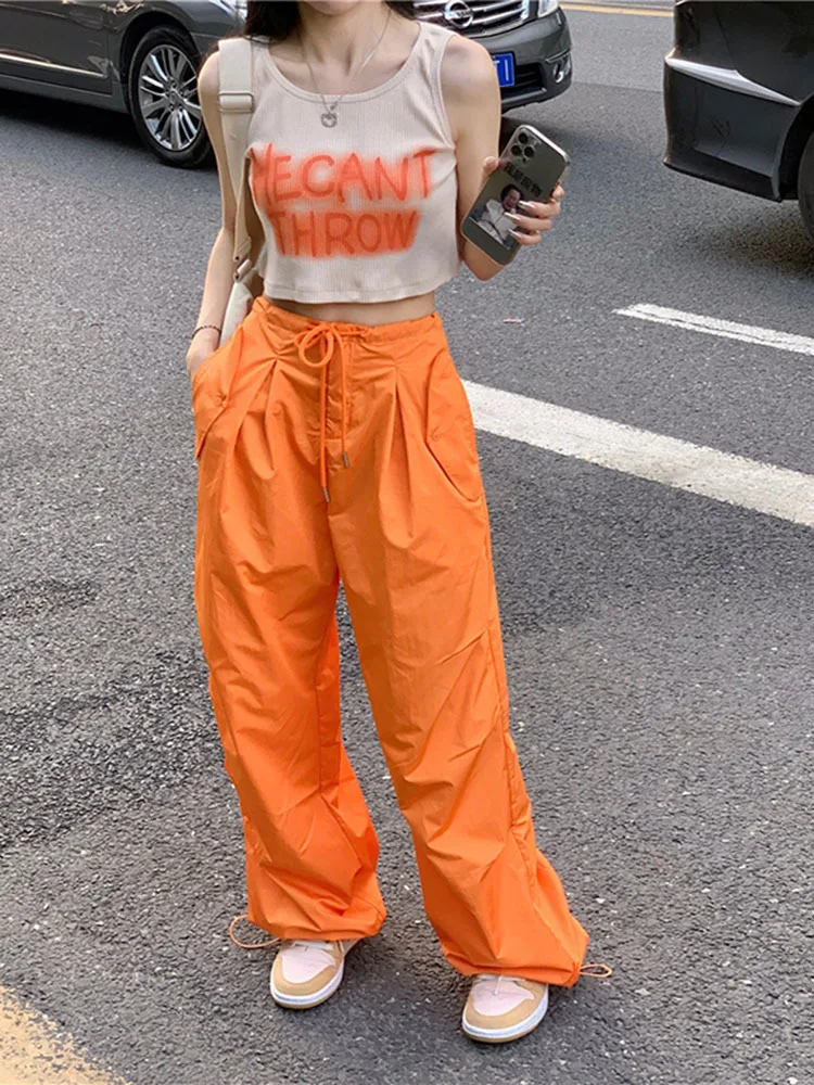 Women Cargo Pants Orange Y2K Casual Hight Rise Trousers Vintage Gothic Aesthetic Streetwear Baggy Wide Leg Joggers Trousers