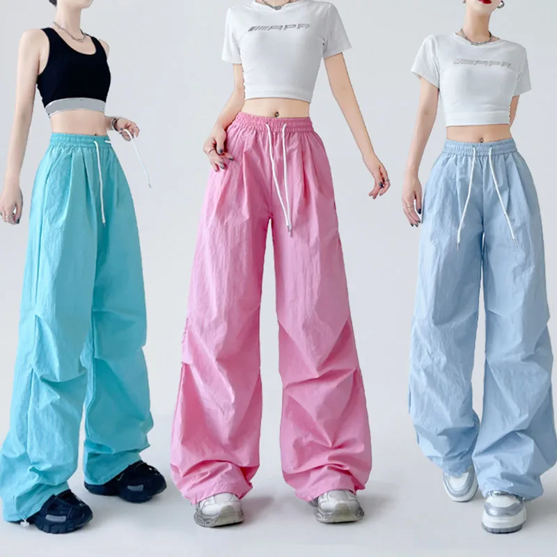 Summer Women's Parachute Pants Drawstring Elastic Waist Y2K Baggy Cargo Pants for Woman Harajuku Streetwear Wide Leg Sweatpants