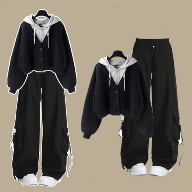 2025 Girl Autumn Winter New Casual Tracksuit Matching Set Korean Elegant Fake Two-piece Hooded Sweatshirt+Loose Cargo Pants Suit