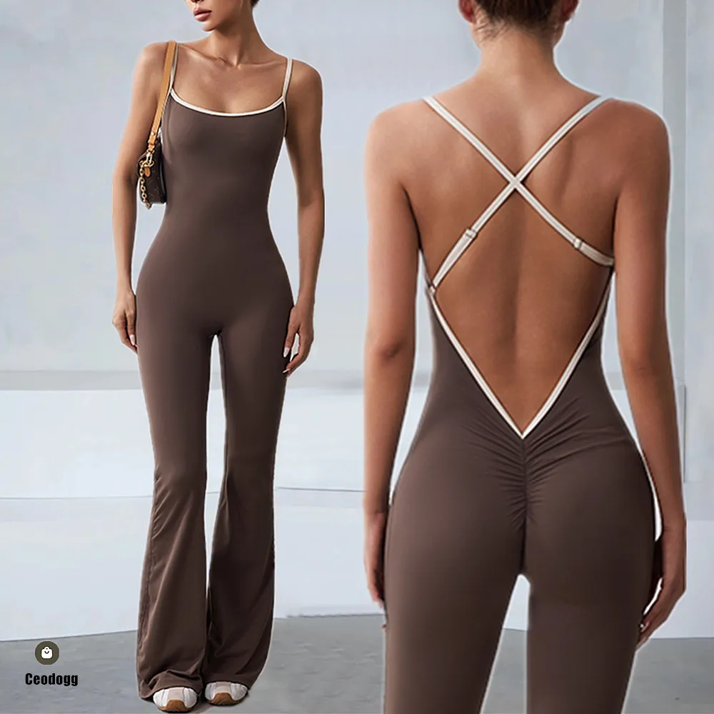 Pad Back V Gym Legging Women Training Yoga Set Sportswear Women Jumpsuit Fitness Rompers Workout Flare Pant Bodysuits XP105