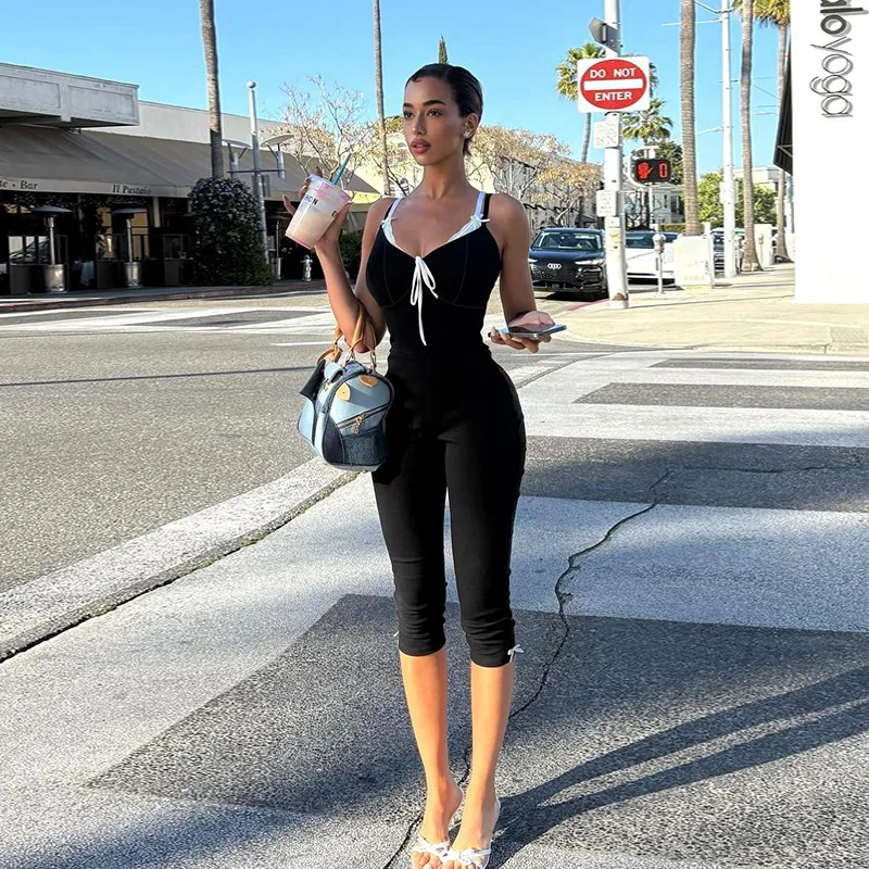 Lace Color Patchwork Bows Camisole Jumpsuits Women Sexy V Neck Spaghetti Straps Backless Skinny Capris Rompers Street Overalls  Read more