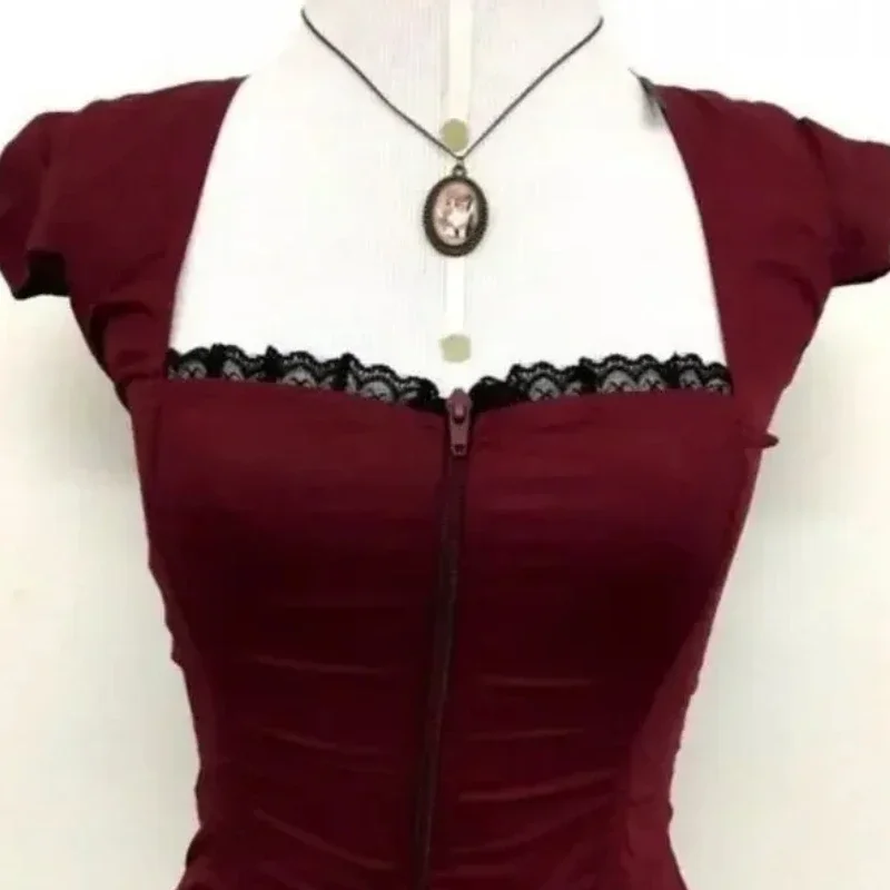 New street fashion red slim t-shirt simple lace top element zipper personalized retro shirt Y2K women gothic clothing