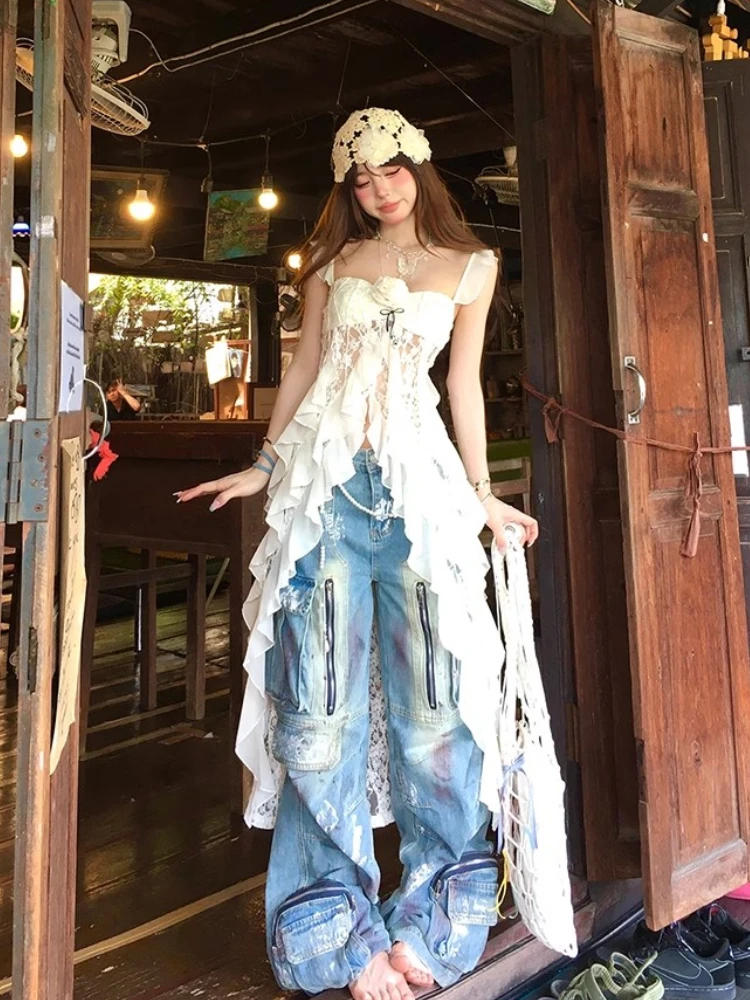 American Vintage Lace Strap Vest Women Summer Sleeveless T-shirts 2000s Retro Clothing Harajuku Korean Tees Design Y2k Crop Top
