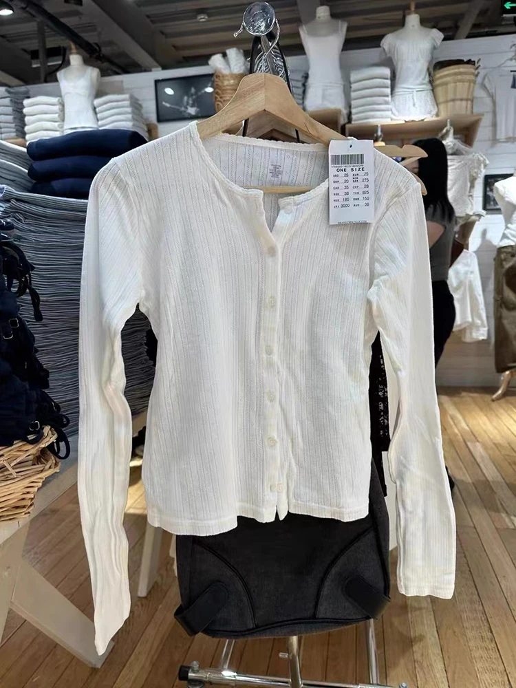 White Eyelet Cotton Slim Long Sleeve T-shirts Women Lace Trim O-neck Single Breasted Tees Autumn Solid Sweet Basic T Shirt Y2k