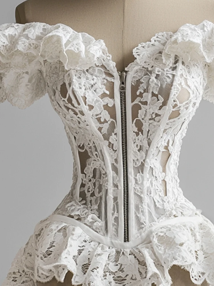 Women Off Shoulder Corset Tops Zipper Ruffle Hem Lace Hollow Out Sexy Elegant Retro Slim Floral Tank Tops Summer Party Club Top