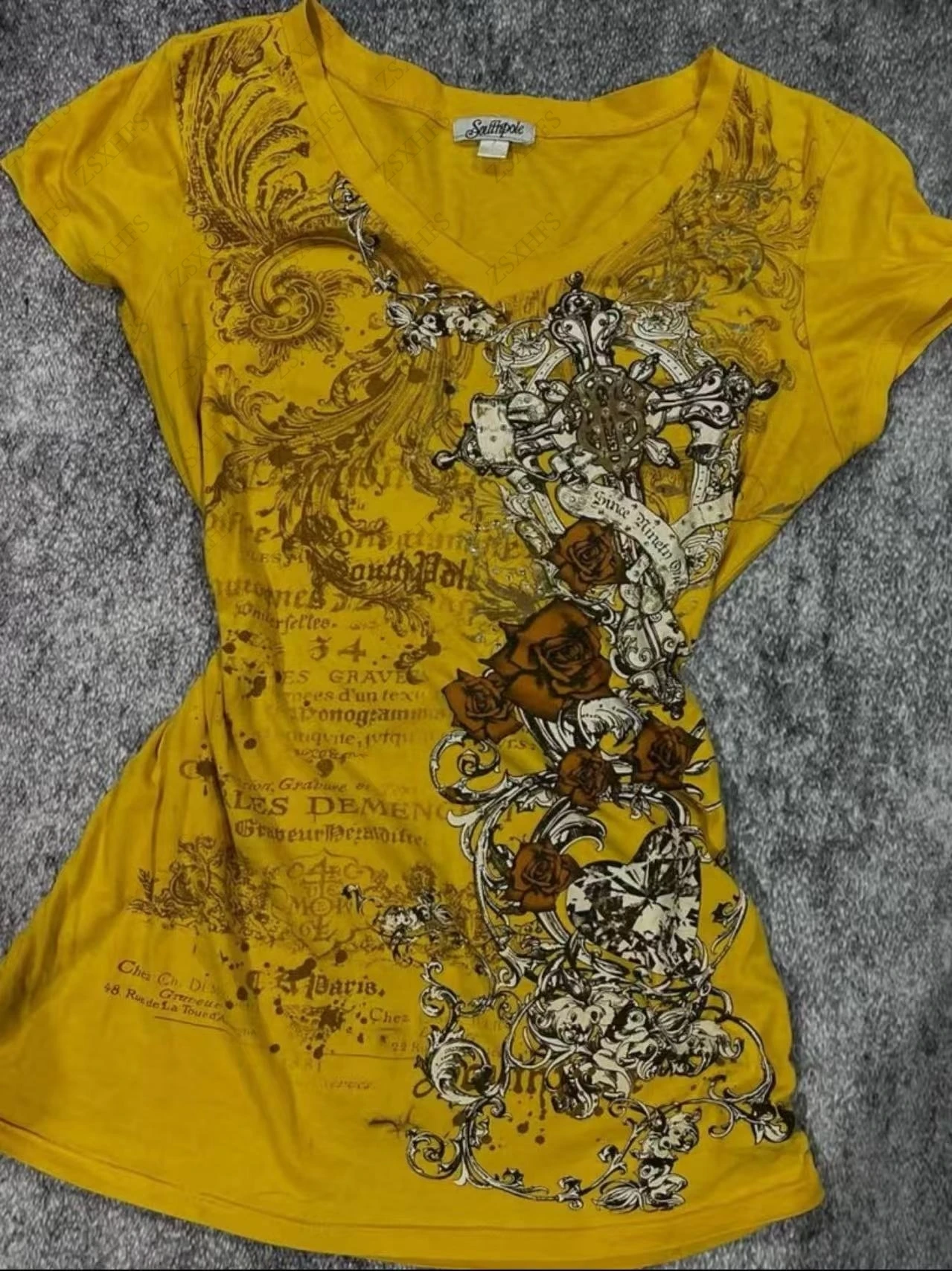 Erwofeina Yellow Patchwork Women's T-shirt Short Sleeve Summer Tops American Retro Skew Collar Graphic Tee 2000s Clothes Y2k  Read more
