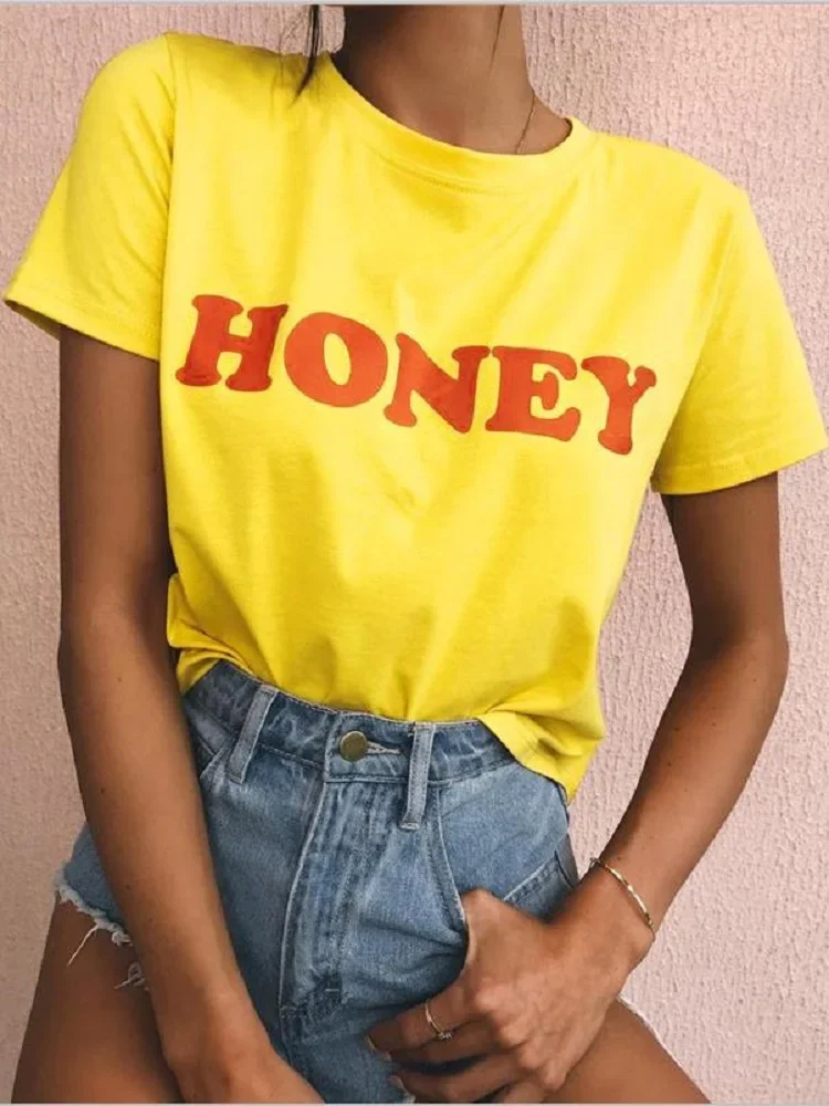 Honey Red Letter Print T Shirt Women Short Sleeve O Neck Loose Yellow Tshirt Summer Ladies Tee Shirt Tops Camisetas Mujer