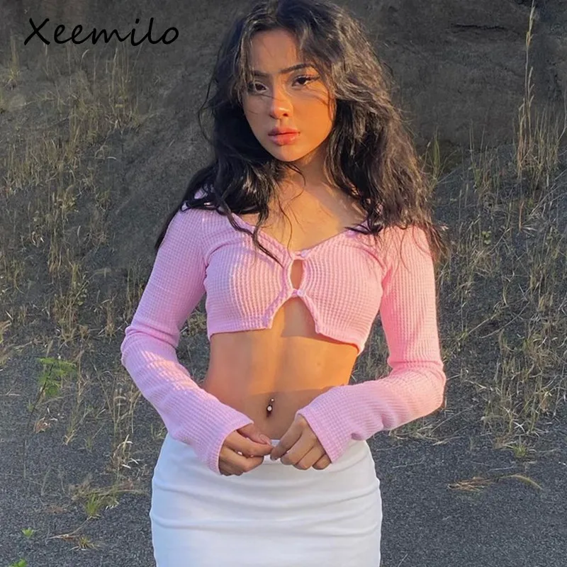 Xeemilo Sexy Y2K Pink Ribbed Knit T Shirt French Gentle Long Sleeves Cardigan Crop Tops High-waist Exposed Navel Women Slim Top  Read more