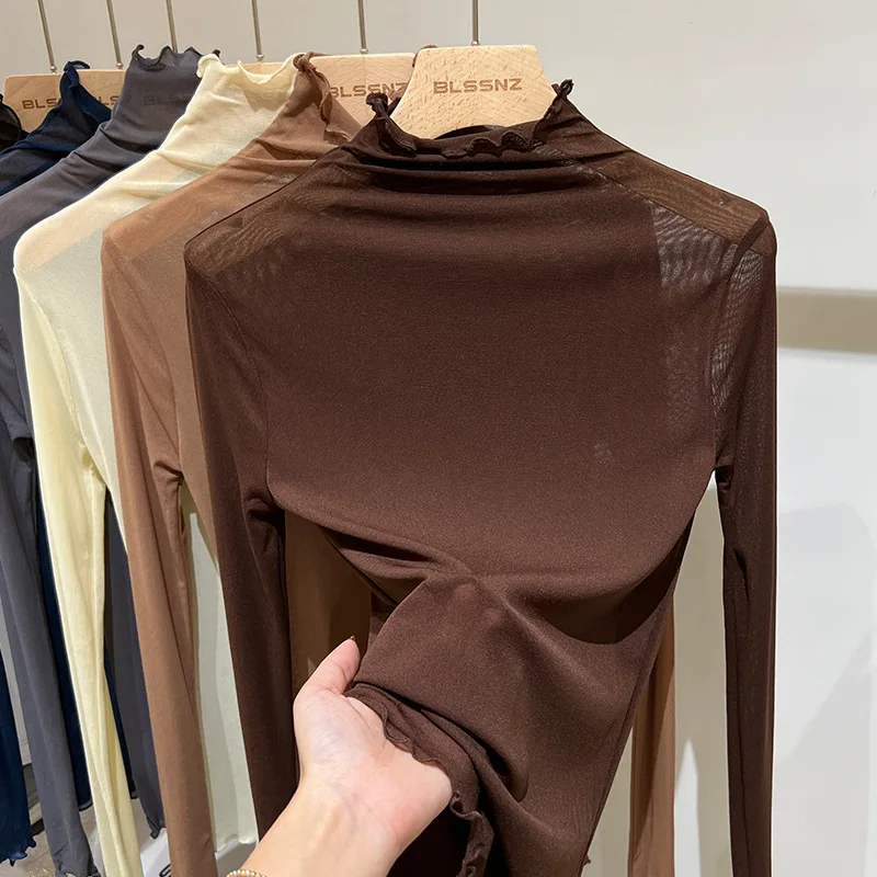 Autumn Winter Round Neck T shirt Women Sexy Mesh Bottoming Shirt Long Sleeve Solid Color Slim Fit Long Sleeve Casual Tops