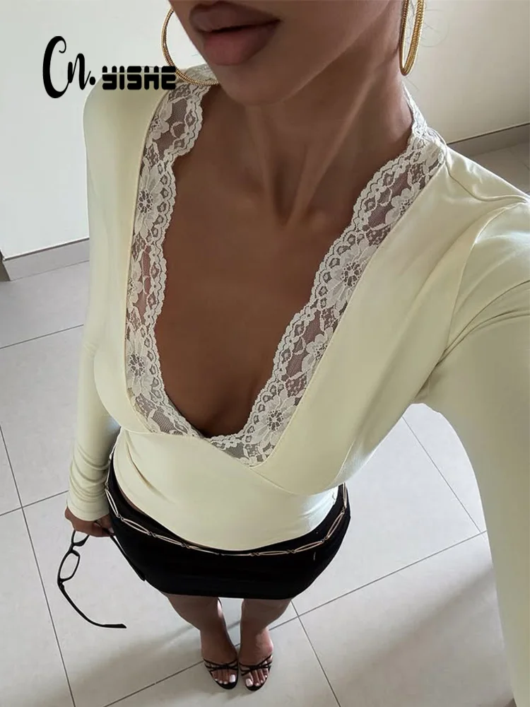 CNYISHE Lace Patchwork Solid Casual Women T-shirts Sexy Club Sheath Fashion V Neck Long Sleeve Female Basic Tops Tees Elastic