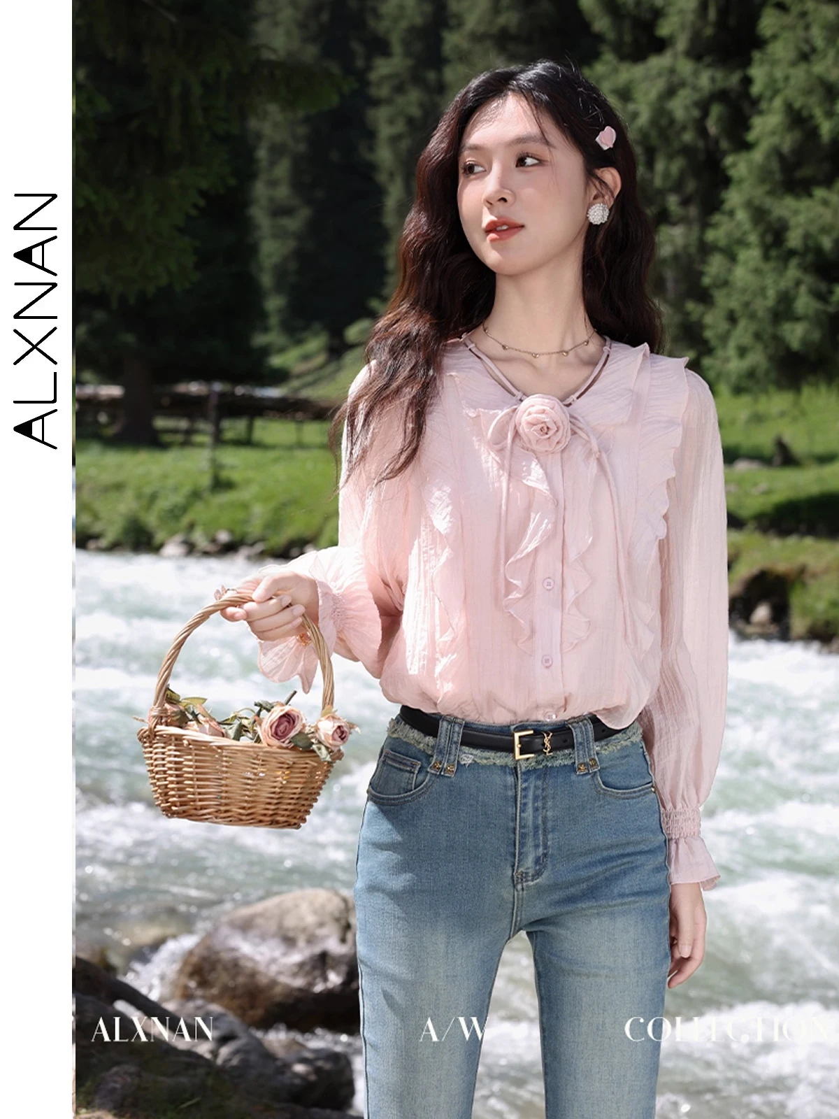 ALXNAN Pink Shirt 3d Flower Lace-up Design Flare Sleeve Woman's Blouses 2025 Fall Elegant V-neck Long Sleeve Tops Ladies L39307