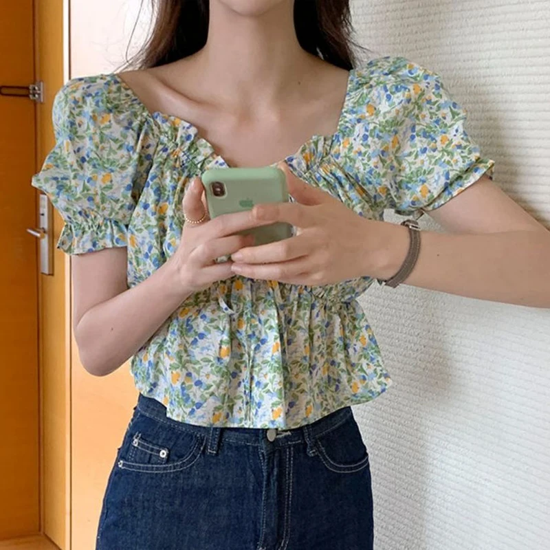 Summer Korean Sweet Short Shirt Floral V-neck Bubble Sleeves for Women Casual Lace Up Mushroom Edge Women's Shirt New 8108#  Read more