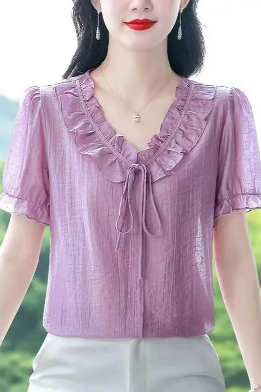New Summer Fashion Versatile Lotus Leaf Collar Lace-up Short-sleeved Chiffon Women Top V-neck Thin  Read more