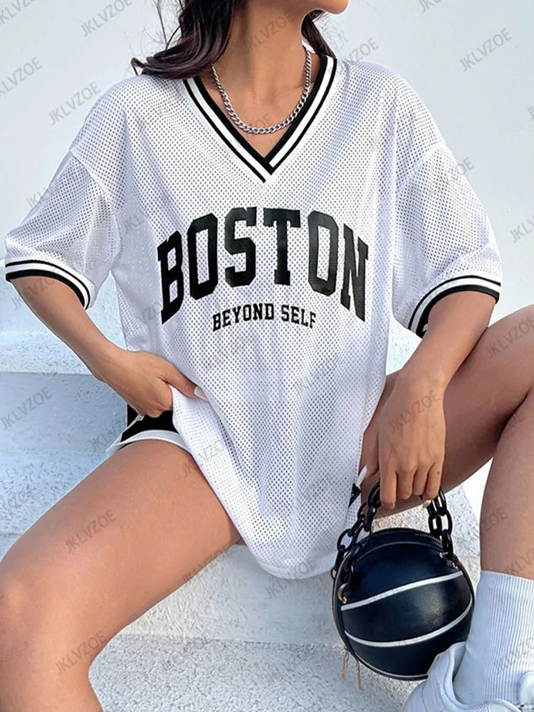 2024 Summer White Boston Print T-Shirt For Women V-Neck Mesh Short Sleeve Sports Football Jersey Y2K Loose Oversized Tops