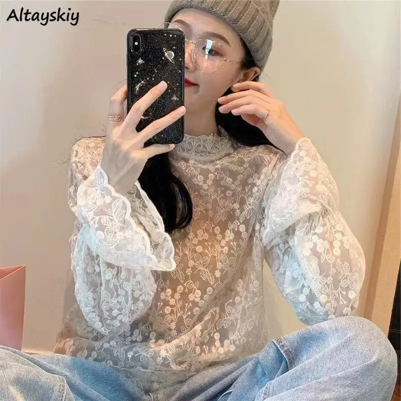 Chic Sexy Tops Mesh Bottom Shirt Women Clothing Tend Autumn Winter Turtleneck Long Sleeve Tops Slim Lace Harajuku Vintage Tops  Read more