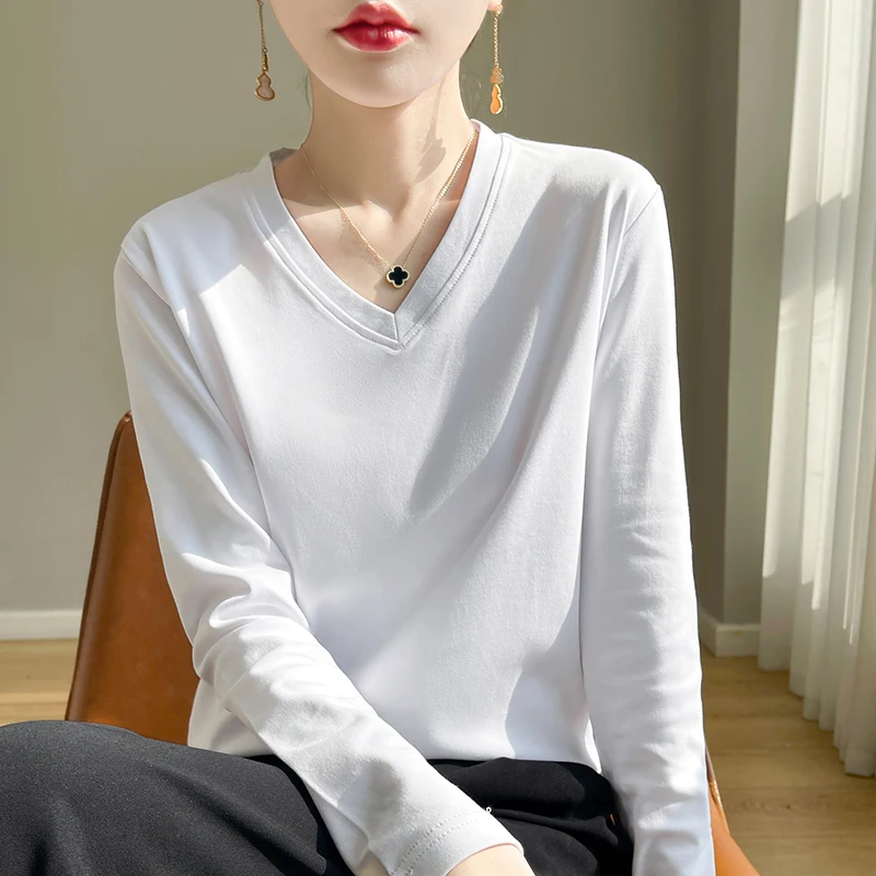 Spring And Summer New Cotton White T-shirt Women's V-neck Long Sleeve Blouse Shoulder Mercerized Cotton Bottoming Shirt