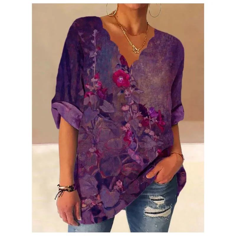 Autumn wave collar cotton linen artistic retro printed shirt long sleeved shirt women's V-neck pullover loose fit new top 2024