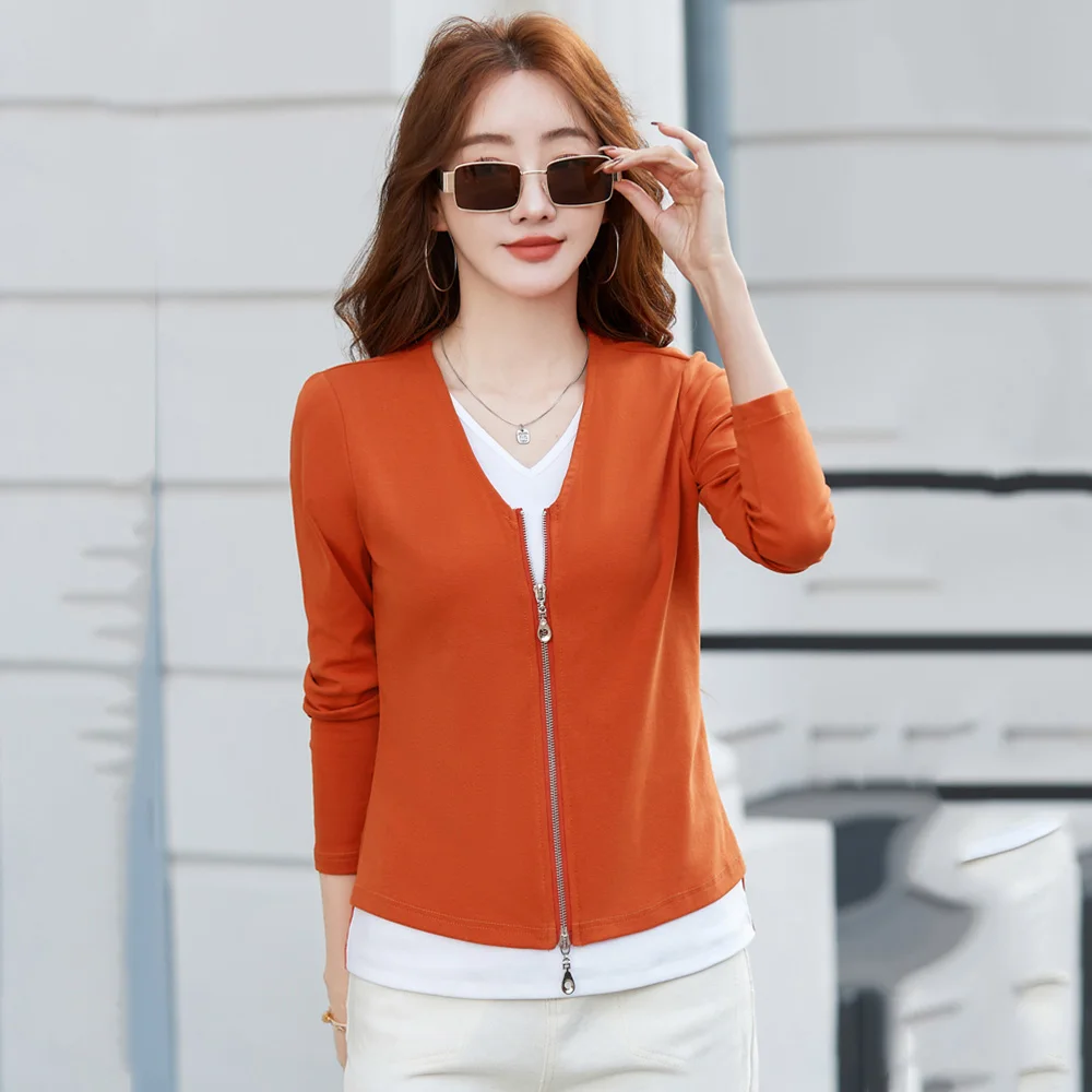 New Women Fake Two Pieces Cotton T-shirt Spring Summer Simplicity Casual Patchwork V-Neck Long Sleeve Slim Tees Tops