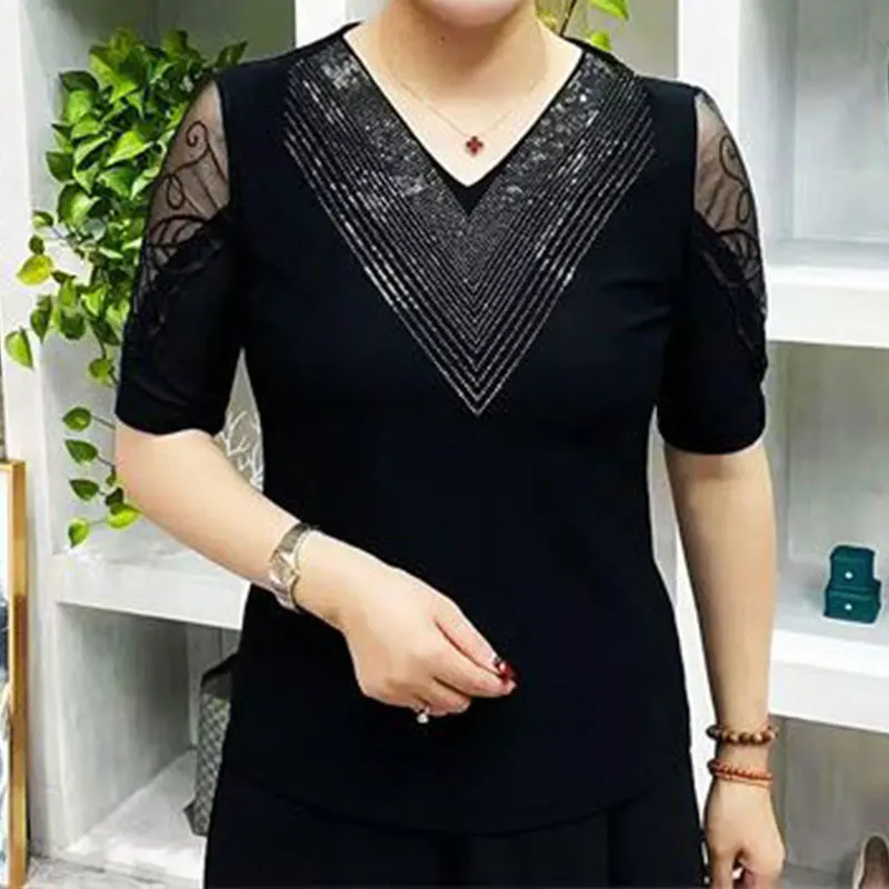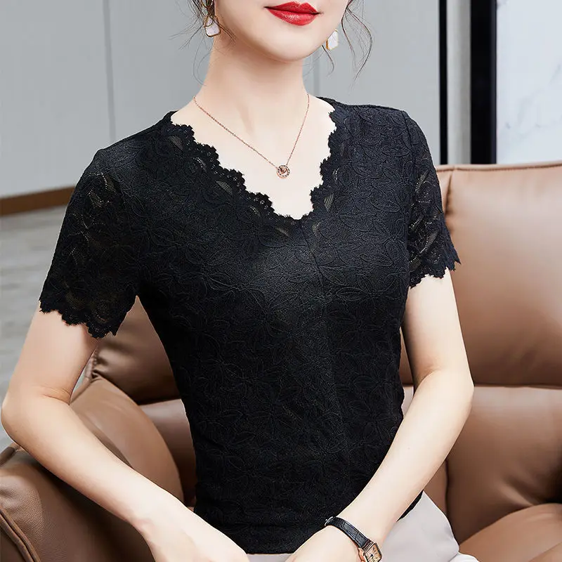 Elegant Fashion Harajuku Slim Fit Female Clothes Loose Casual All Match Tshirts Solid Lace V Neck Insert Short Sleeve T-shirts  Read more