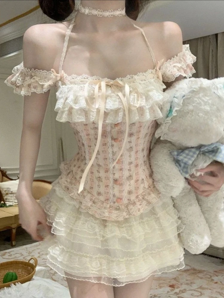 Harajuku Sweet Fashion Floral Slim Fit Short Sleeve Tops + Y2k High Waist Ruched Lace Skirts Woman Summer New Two Piece Sets