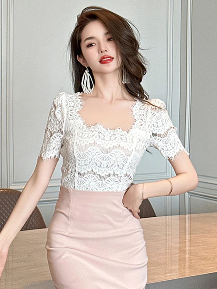 Fashion Elegant White Blouse Hook Floral Hollow Women Tops Sweet Outfits Sheer Lace Sexy T-Shirts Tees Party Street Date Clothes