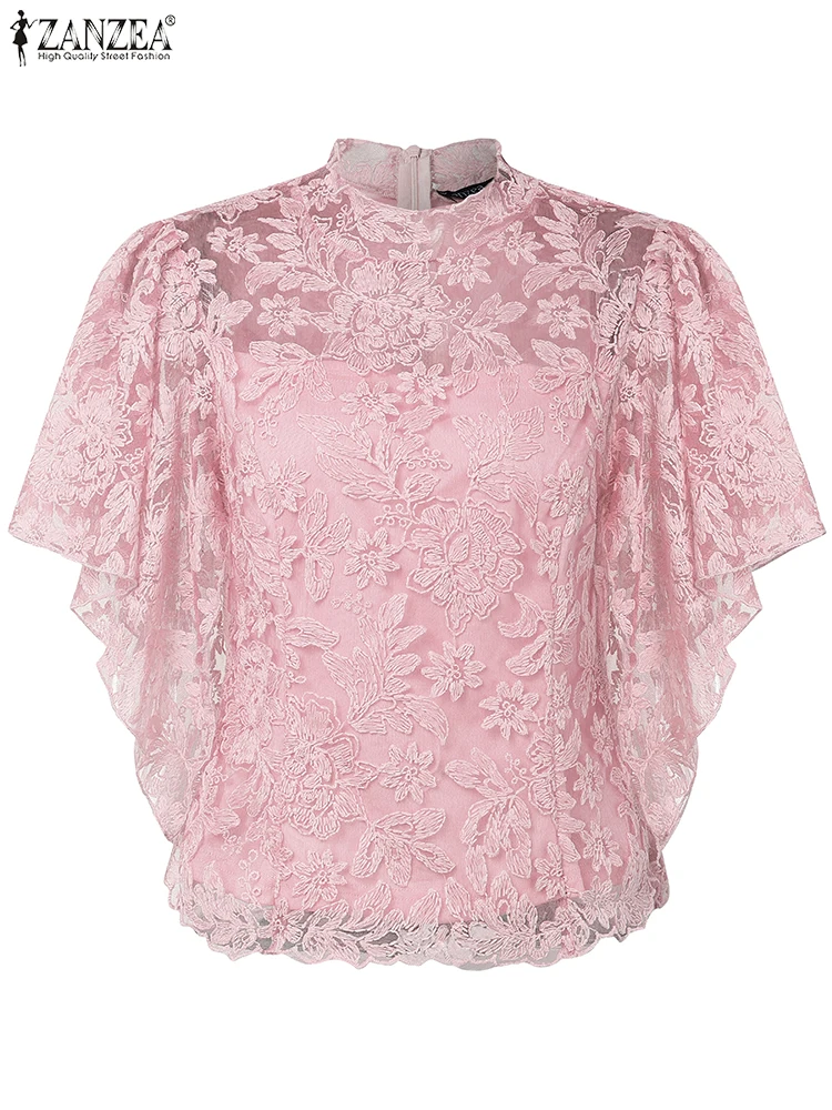 Shirts & Blouses - Solid Print - Short Sleeve - Lace |