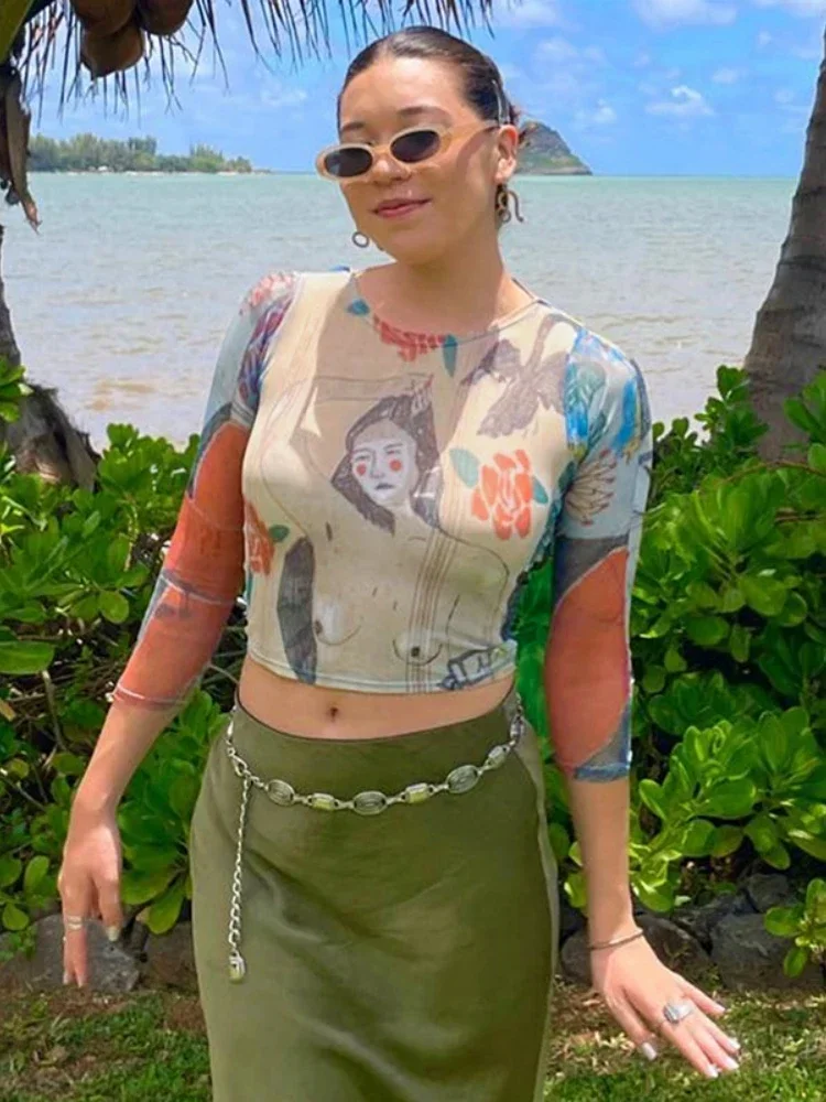 Casual Fashion Graphic T Shirts O-Neck Long Sleeves Short Y2k Top Slim Fit Mesh Splicing Lace-Up Streetwear Women Clothes  Read more