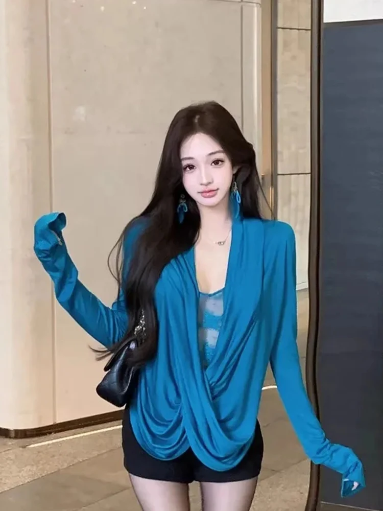 Two-piece Set Fashion Women T-Shirts Solid Color Thin Breathable Lace Long Sleeves Bodysuits Tops Y2K Streetwear Garment