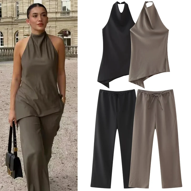 HXAO Sets For Women 2 Pieces Satin Pant Sets New Matching Sets Autumn Asymmetric Crop Halter Top Lace-Up High Waist Trousers Set