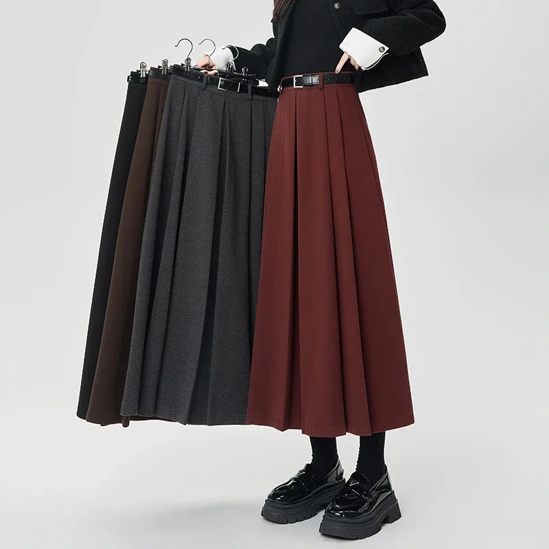 Woolen Pleated A-line Skirts Female 2025 Autumn Winter High Waist Slim Drape Skirts Casual All Match with Belt Mid-Length Skirts